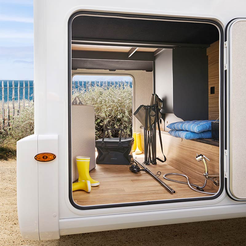 – Eine großzügige Beleuchtung, eine Verzurrschiene und eine 230-V-Steckdose in der Heckgarage sorgen für mehr Komfort.